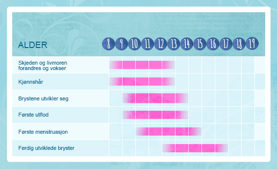 Ikke legg for stor vekt på aldersangivelsene nedenfor – dette er gjennomsnittstall og er kun ment å være veiledende. Illustrasjonen viser når de fysiske forandringene kan inntreffe. Variasjoner på flere år er helt normalt.